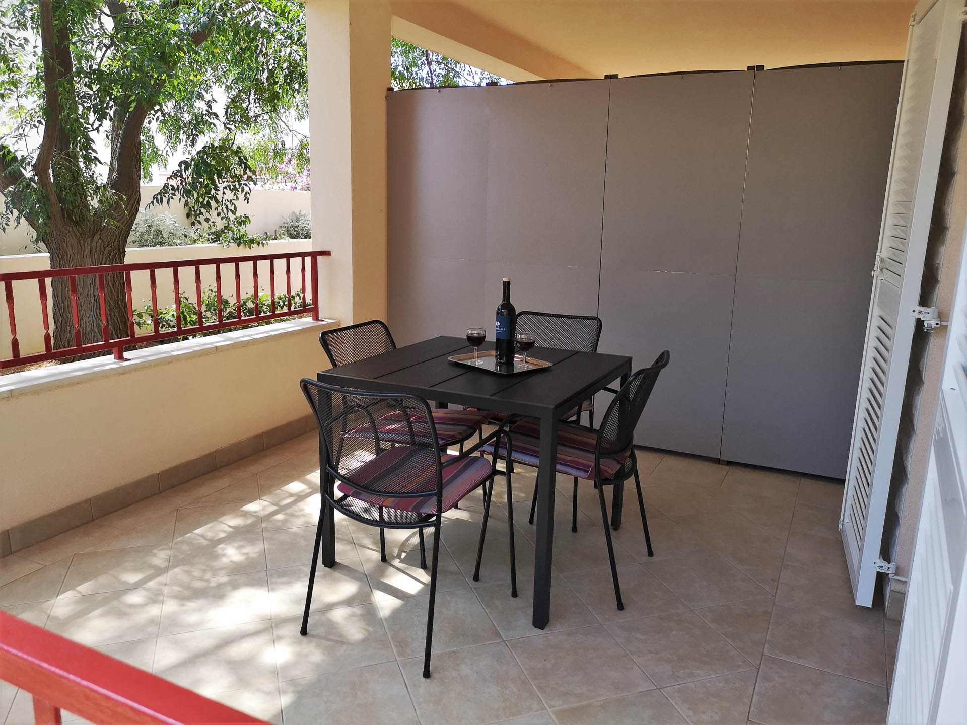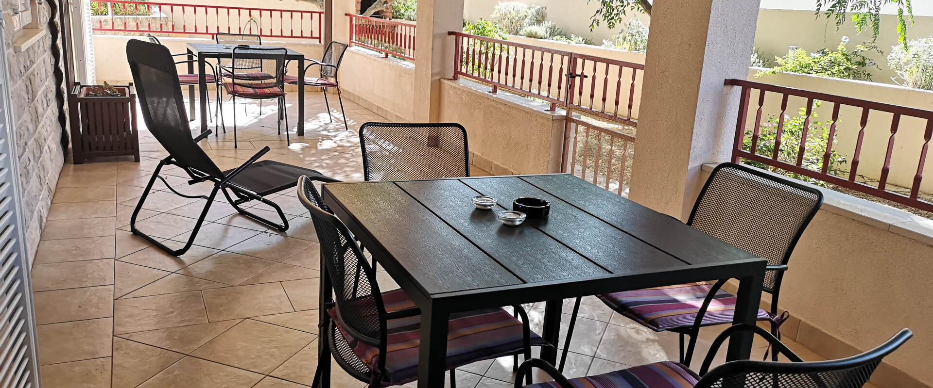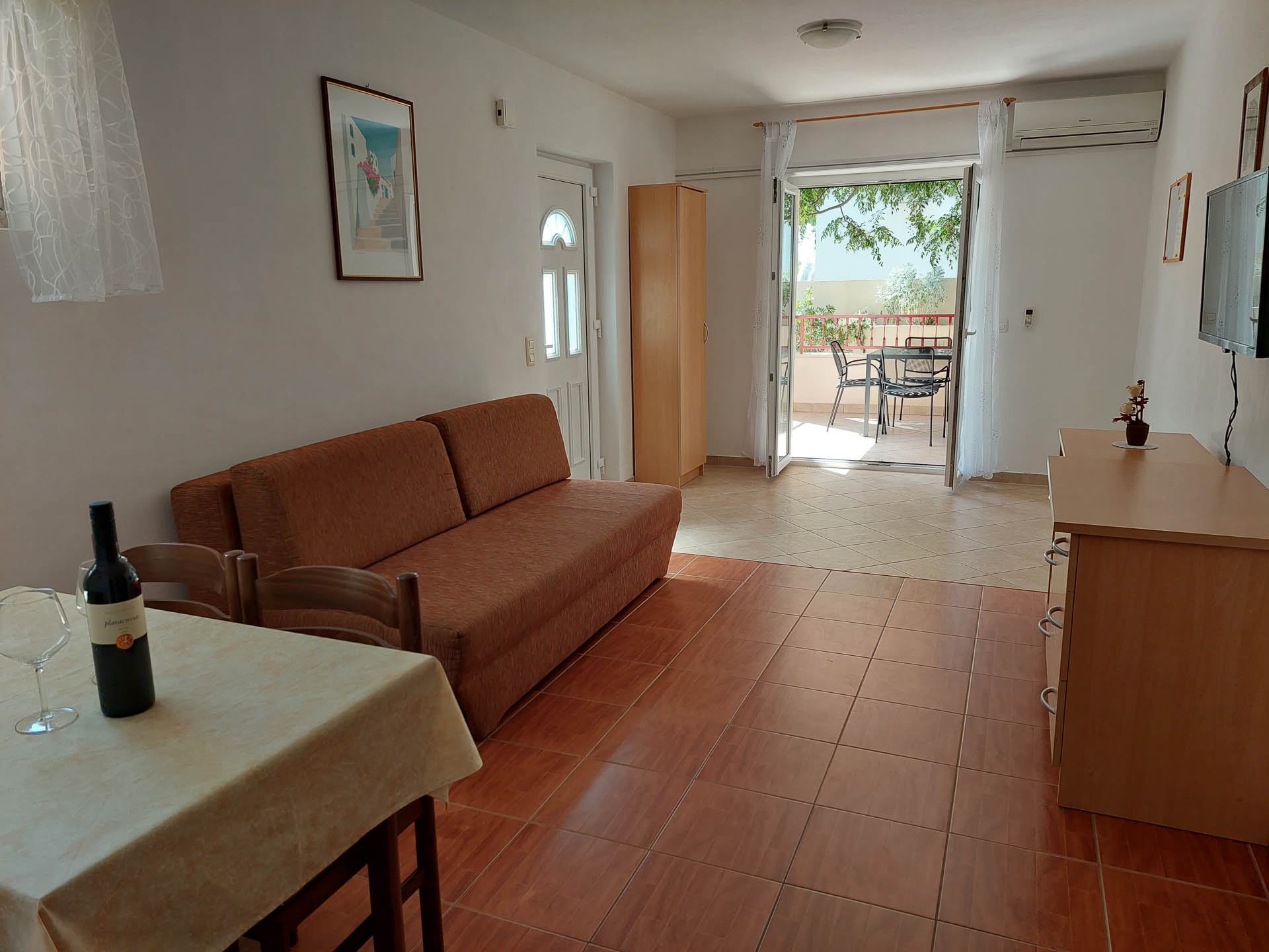 Apartment A4 is on the ground floor and consists of one triple bedroom, a living room and a kitchen with adjoining dining area and a terrace of about 11 m2. In the living area there is a sofa bed. The terrace is surraunded by Mediterranean garden full of lavander and rosemary plants.